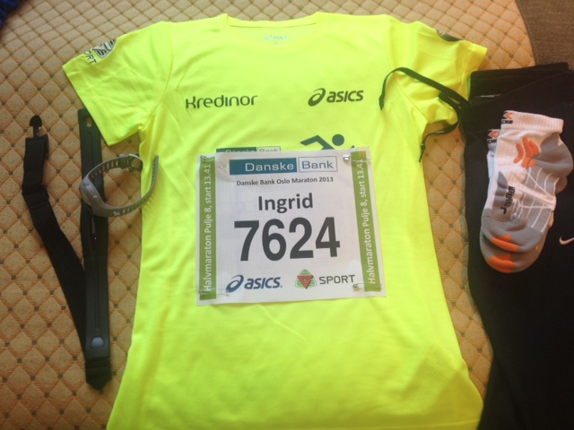 StartnummerEllers har vi hentet startnummer, kjøpt kaffe hos Nespresso, kjøpt nye strømper for å slippe gnagsår I morgen og observert mange med oransje ryggsekk som det står OSLO MARATON på. Champagnen er lagt til kjøling og den skal vi kose oss med  i morgen.