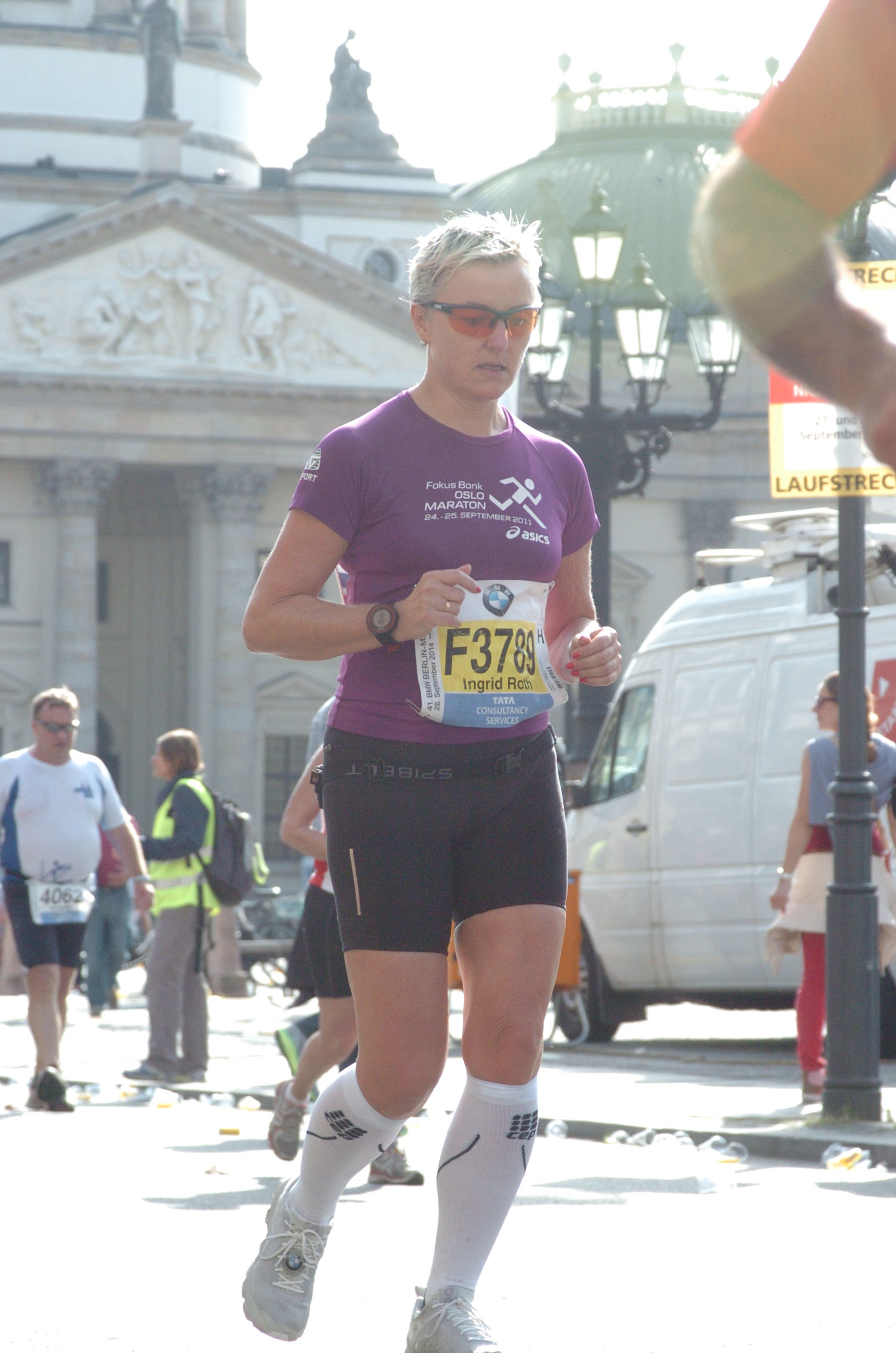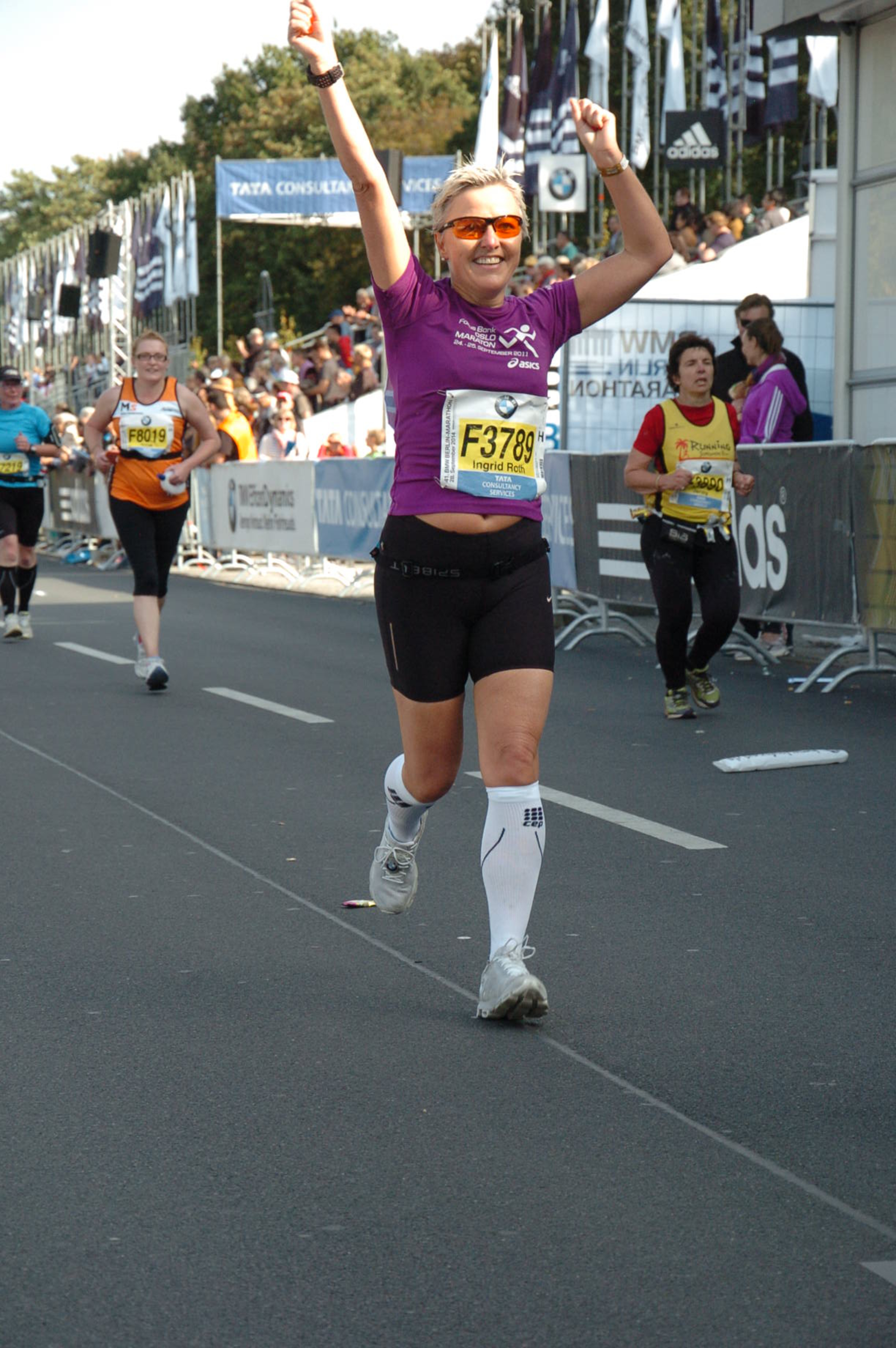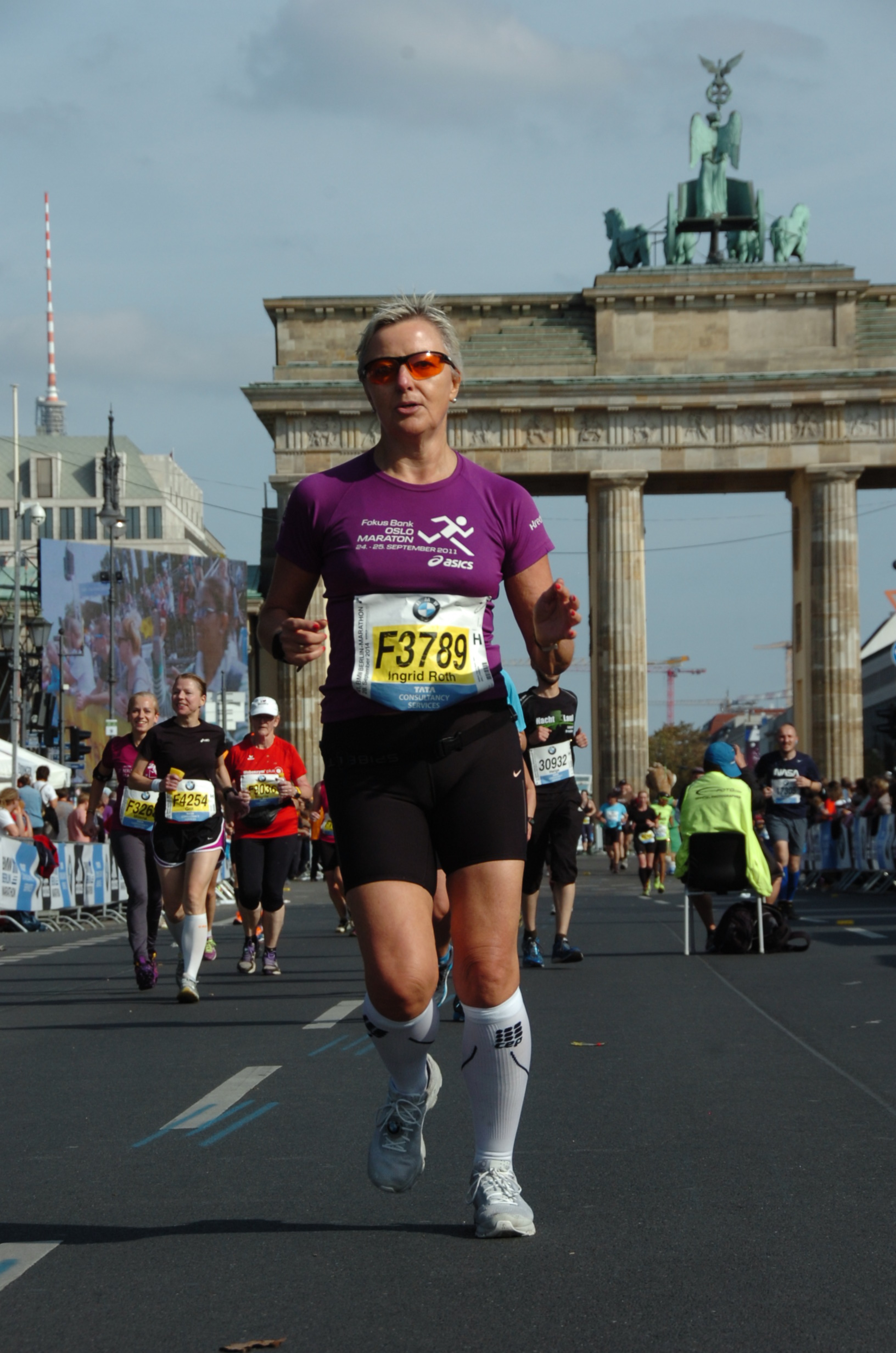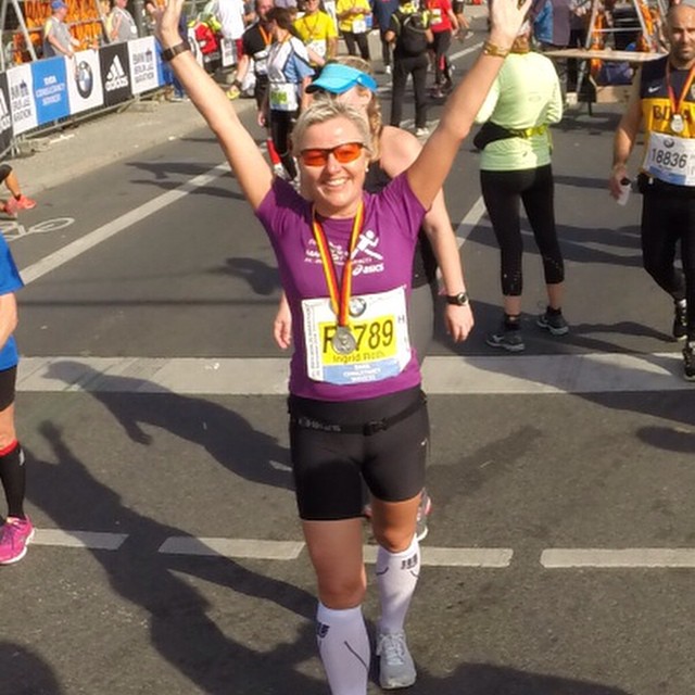 Det blir tyngre, noe har skjedd med venstre ankel, jeg kjenner smerter, men løper videre. Slapp av I kroppen sier jeg til meg selv mens jeg løper, bruker pusten som verktøy for å få oksygen ut I musklaturen. 1 km om gangen og jeg ser mange med medaljer rundt halsen. Super Ingrid, just 500 meters to the finish line! De heier oss frem og med ett løper jeg gjennom Brandenburger Thor.