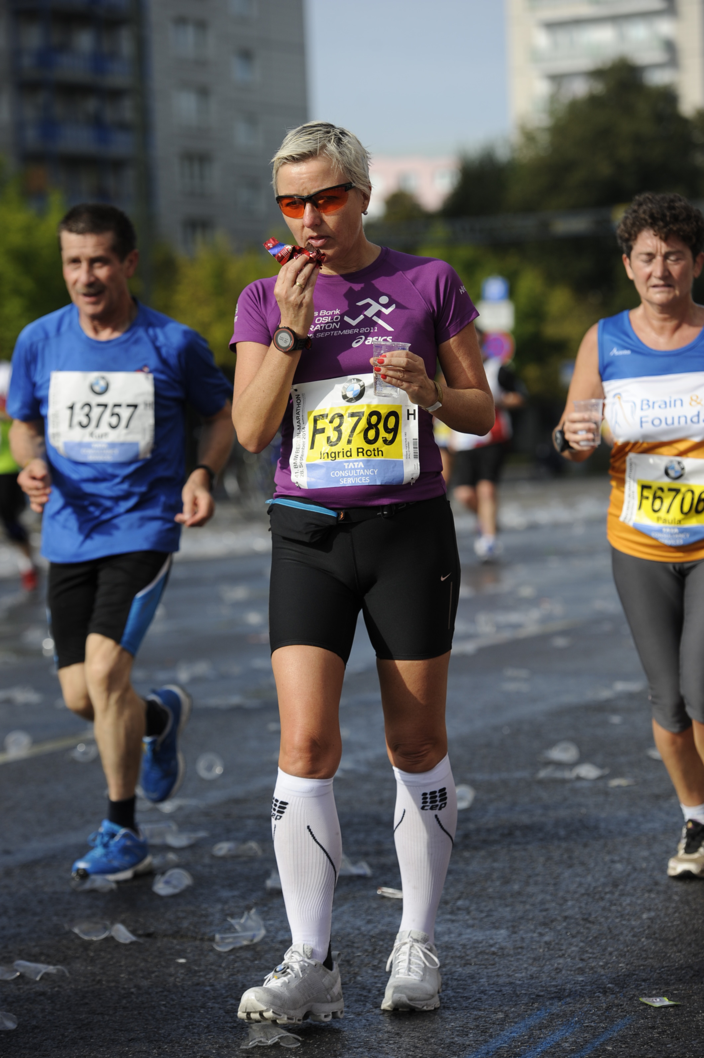Etter halvmaraton, begynner opphentingen. Jeg løper forbi mannen i hvit dress og hatt. Jesus som løper med korset på ryggen og jeg løper forbi ølflaska. Mange er slitne nå og har redusert farten. Jeg fortsetter I samme tempo og løper forbi mange og får fylt på selvtilliten! En hyggelig svensk kvinne løper ved siden av meg til neste drikkestasjon. Hun og jeg følges et godt stykke videre I løpet. En stund løper jeg forbi henne og så løper hun forbi meg og slik fortsette vi flere km.