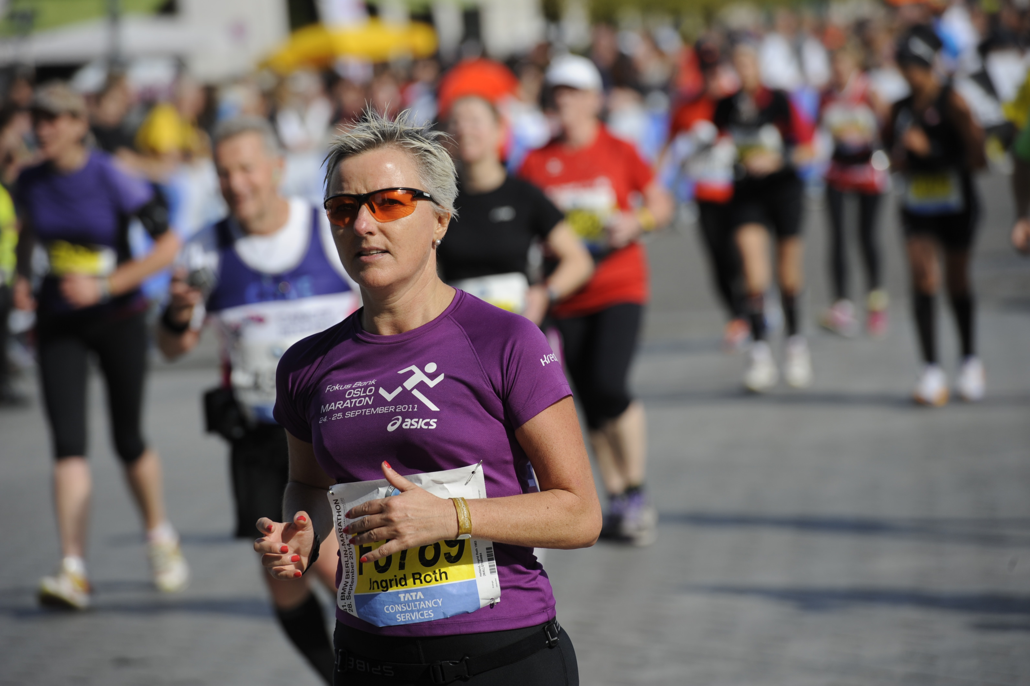 Engelskmannen skriker meg inn i ørene » I just want to start running and make it to the finishline». Jeg kjenner pusten hans i mitt høyre øre hver gang han skriker ut noe til sidemannen. Rett bak meg står en ung kvinne med en gul plassekk over skuldrene som hun holder tett over brystet for å holde varmen. Det er ca 8 grader, klokken er 8.10 og jeg hører tennene hennes klapre. En godt voksen kvinne med langt bleket hår satt i hestehale, gjemt under en caps stiller seg opp ved min høyre side Hun ser utrolig sprek ut, lang og slank er hun i sin rosa skjorts, gul singlet, hun har blå øyenskygge og rosa leppestift, men hun fryser og tripper lett for å holde varmen.