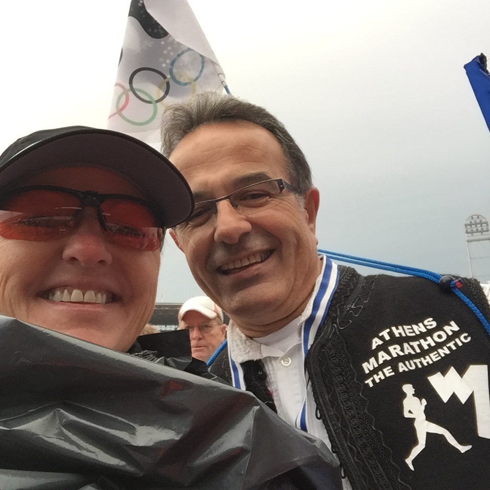 IMG_4609Starten går, eliteløperne er igang. Olympiastadion er fylt opp med publikum som klapper oss avgårde. For en stemming! Jeg er plassert I siste pulje sammen med de som har estimert sluttid 4.30 og oppover. Mens vi venter på at det skal bli vår tur, prater jeg med Konstantinos fra Hellas, han er kledd I greske farger, hvitt og blått – kappe, hvit strømpebukse, noe som ligner et skjørt samt tresko. Han markedsfører maraton I Athen og planen hans er å løpe 3 km I dette antrekket, for så å skifte sko og ta av kostymet. Tar en selfie mens vi venter – jeg med grå søppelsekk over løpeklærne for å holde på varmen.
