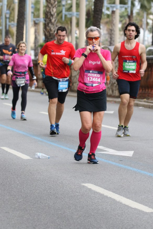 Lette bein fra start av. Dette blir en utrolig bra dag, jeg tenker på fjorårets maraton I Barcelona og den dårlige oppkjøringen I forkant med en stresset tarm og det meste fungerte dårlig, til I år med nok km I beina og en kropp som fungerer veldig bra. I dag kan det bare gå godt, det blir garantert ny pers med denne farten.