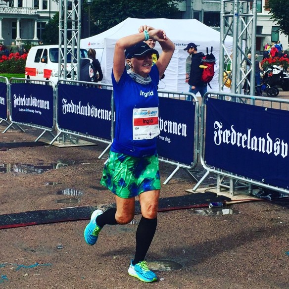Dytter bort de negative tankene, løper langs Otra, spiser mine 2 seigmenn, løper gjennom gågata for 6. gang! Og blir heiet fram av publikum. Heia Ingrid!